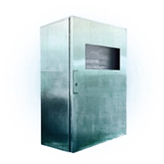 2、箱體分上箱體、下箱體(為斜面式吻合,吻合面上下端部箱體為弧型)。上下箱體用不銹鋼合葉連接,由橡塑條密封,下端安裝不銹鋼吊扣以壓緊。前開門帶觀察窗,有傾斜式防雨頂蓋,門與箱體之間采用防濺結(jié)構(gòu),能防雨防塵,適與室內(nèi)外安裝;